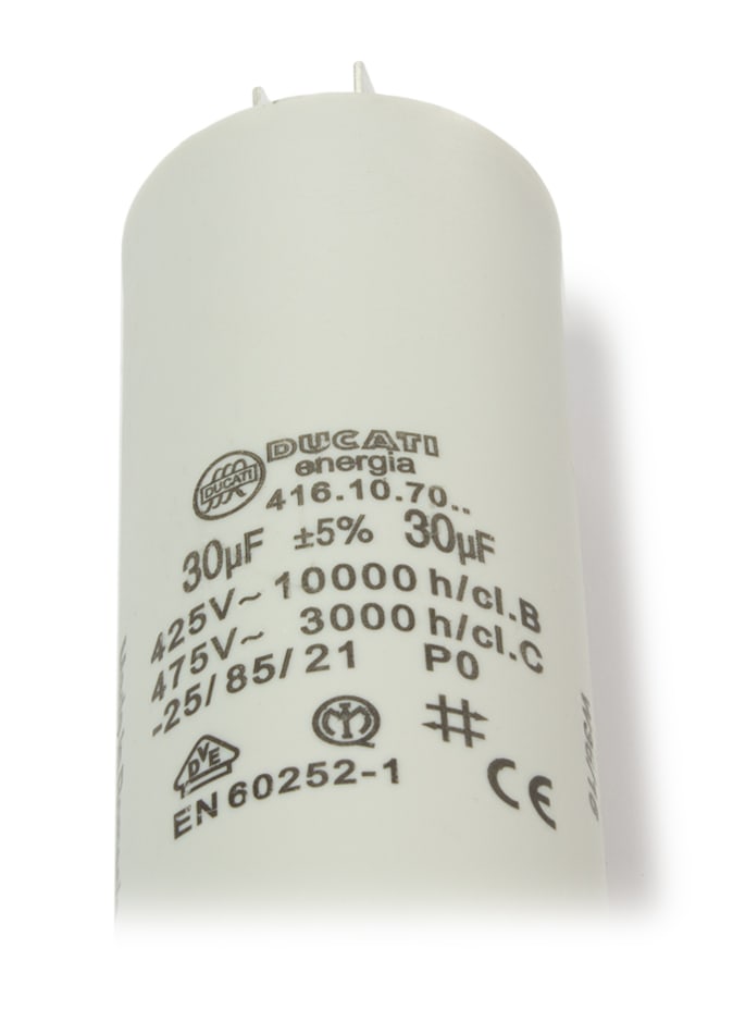 Condensatorul de 30µF (microfarazi) de la DUCATI Energia este o componentă de înaltă performanță, concepută pentru motoare electrice monofazate solicitante. Fabricat în Italia, acest condensator de tip "motor run" este piesa esențială pentru a asigura cuplul necesar la pornirea utilajelor care necesită o forță de tracțiune ridicată.