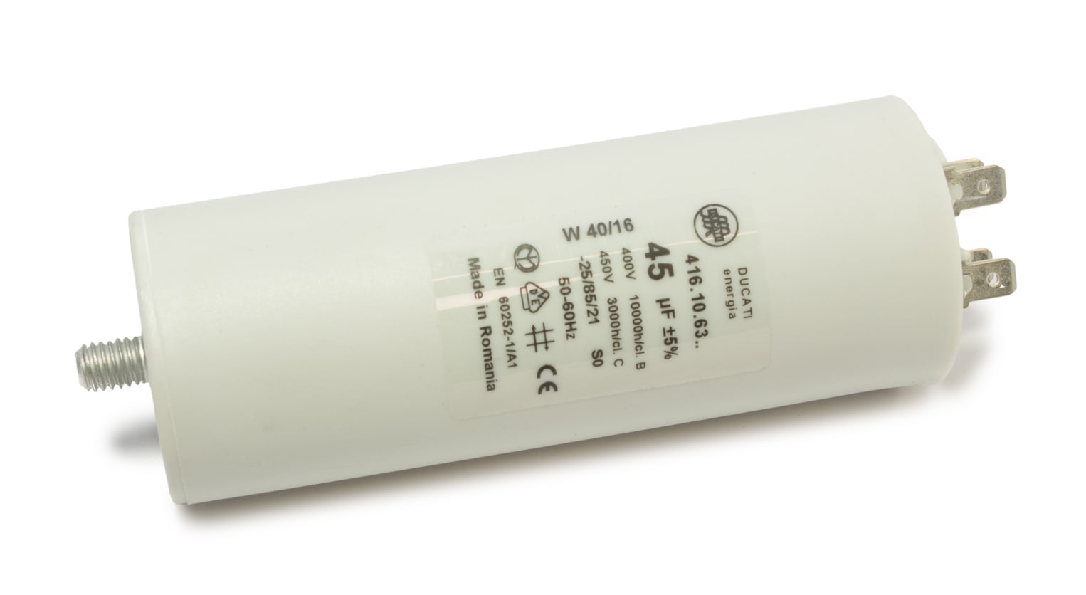 Condensatorul de 45µF (microfarazi) de la DUCATI Energia este un component electric de nivel industrial, esențial pentru funcționarea corectă a motoarelor asincrone monofazate de mare putere. Fabricat în Italia, acest condensator de tip "motor run" este proiectat să reziste la solicitări intense, asigurând defazajul necesar pentru un cuplu de pornire ridicat și o eficiență optimă a consumului de energie.