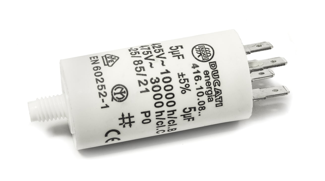 Condensatorul de $5\mu\text{F}$ (microfarazi) de la DUCATI Energia este o piesă de schimb esențială, utilizată pentru a asigura defazajul necesar pornirii și funcționării eficiente a motoarelor asincrone monofazate. Fabricat în Italia, acest condensator de tip "motor run" este recunoscut pentru fiabilitatea sa pe termen lung, fiind alegerea principală a multor producători de electrocasnice.