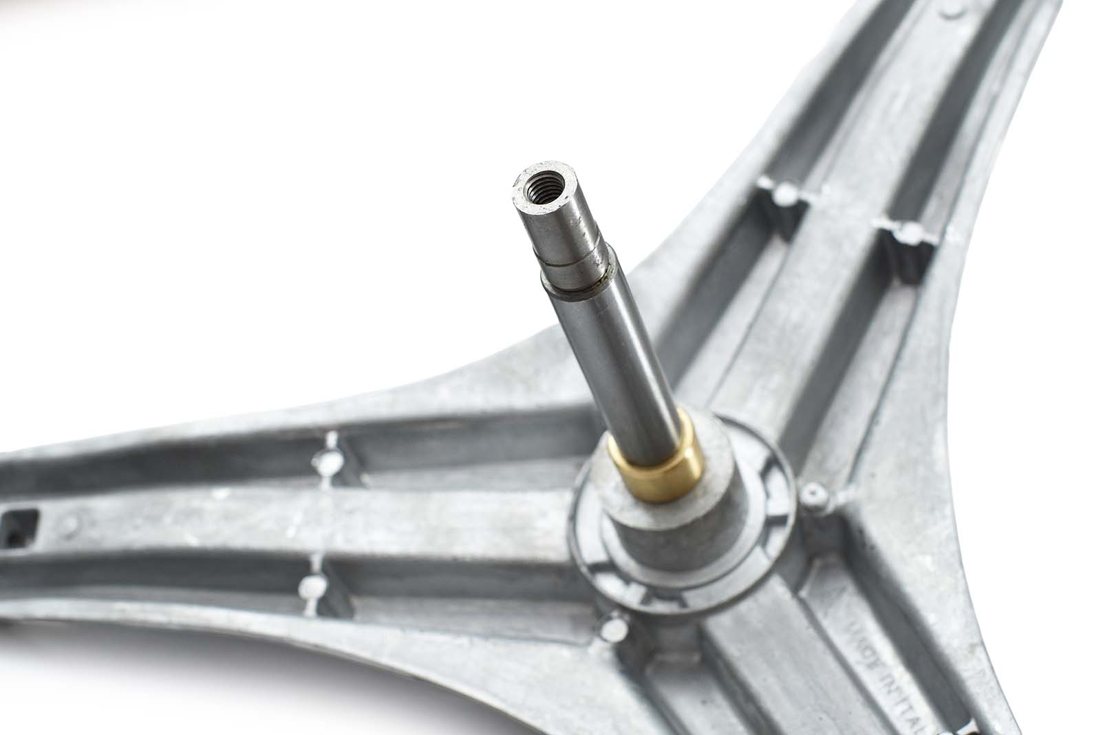 Piesa este fabricată dintr-un aliaj Zamac de înaltă densitate, rezistent la coroziunea chimică provocată de detergenți. Axul este prelucrat cu precizie pentru a găzdui setul de rulmenți standard: 6204 (interior) și 6203 (exterior). Bucșa pentru simering de 25 mm oferă o suprafață de contact perfectă, asigurând o etanșare de lungă durată și protejând întregul sistem de rulare împotriva infiltrațiilor.